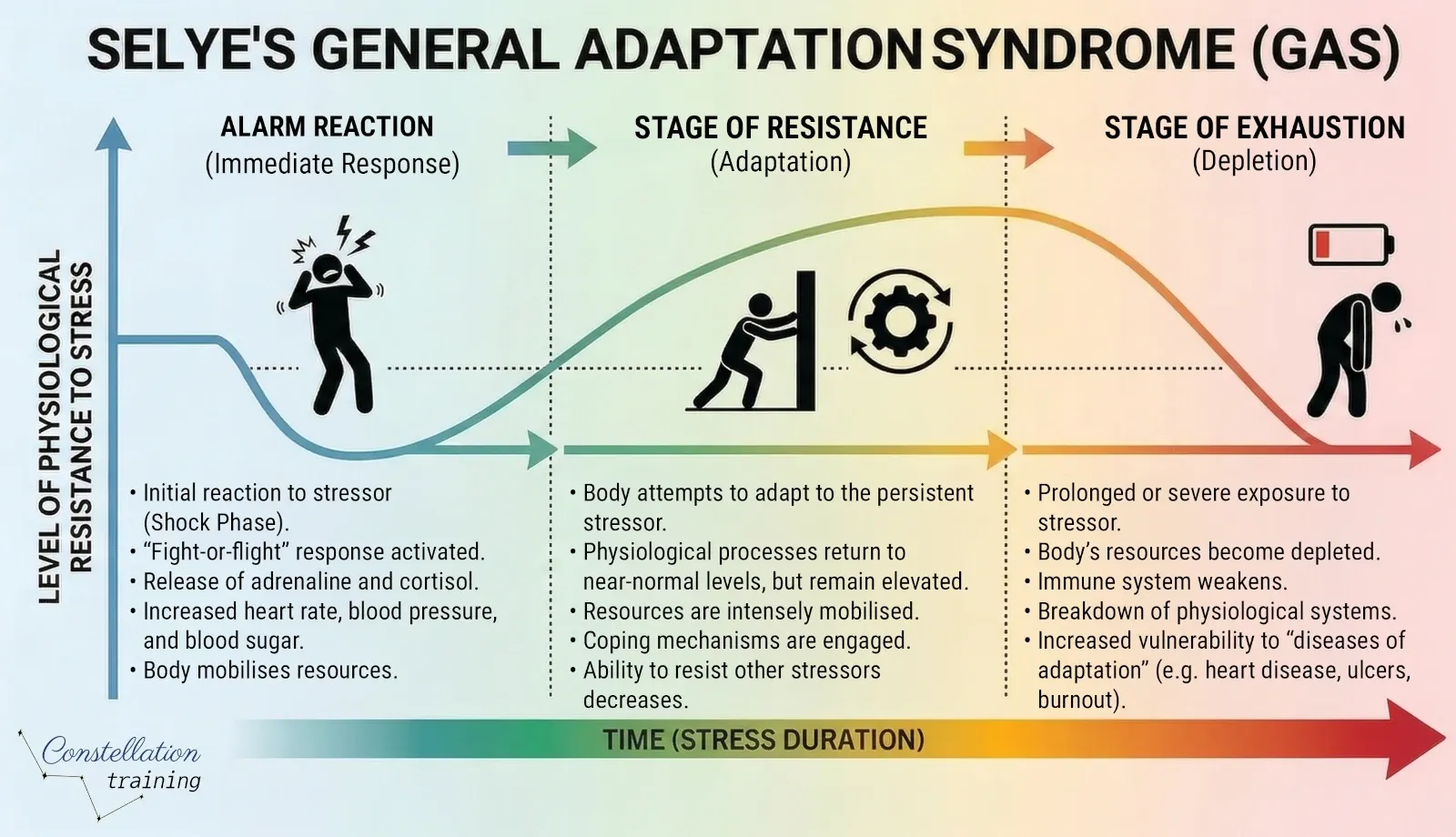 | Alarm Reaction | The initial shock response. Adrenaline and cortisol flood the system. The sympathetic nervous system activates and resources are mobilised. This is Cannon's fight-or-flight in action. |